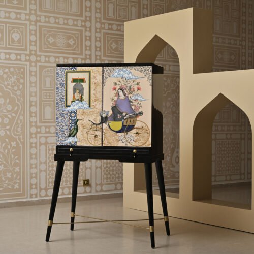 An intimate bar cabinet that transforms utility into theatre. Its surfaces are adorned with digitally printed miniature art, layered with metal accents. A conversation starter as much as a keeper of spirits, Bar Bar Dekho invites you to look closer — again and again — discovering new detail each time.