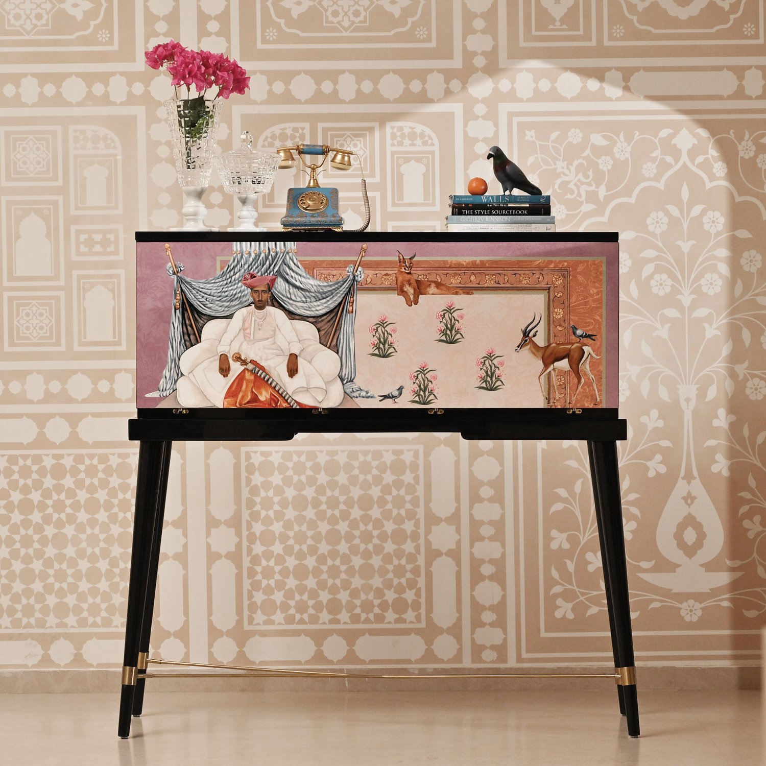 A long bar cabinet that expands the intimacy of Bar Bar Dekho into a grand procession. Digitally printed wooden surfaces, highlighted with metal accents, turn this into a statement piece — a cabinet that celebrates gathering, festivity, and the pageantry of indulgence.